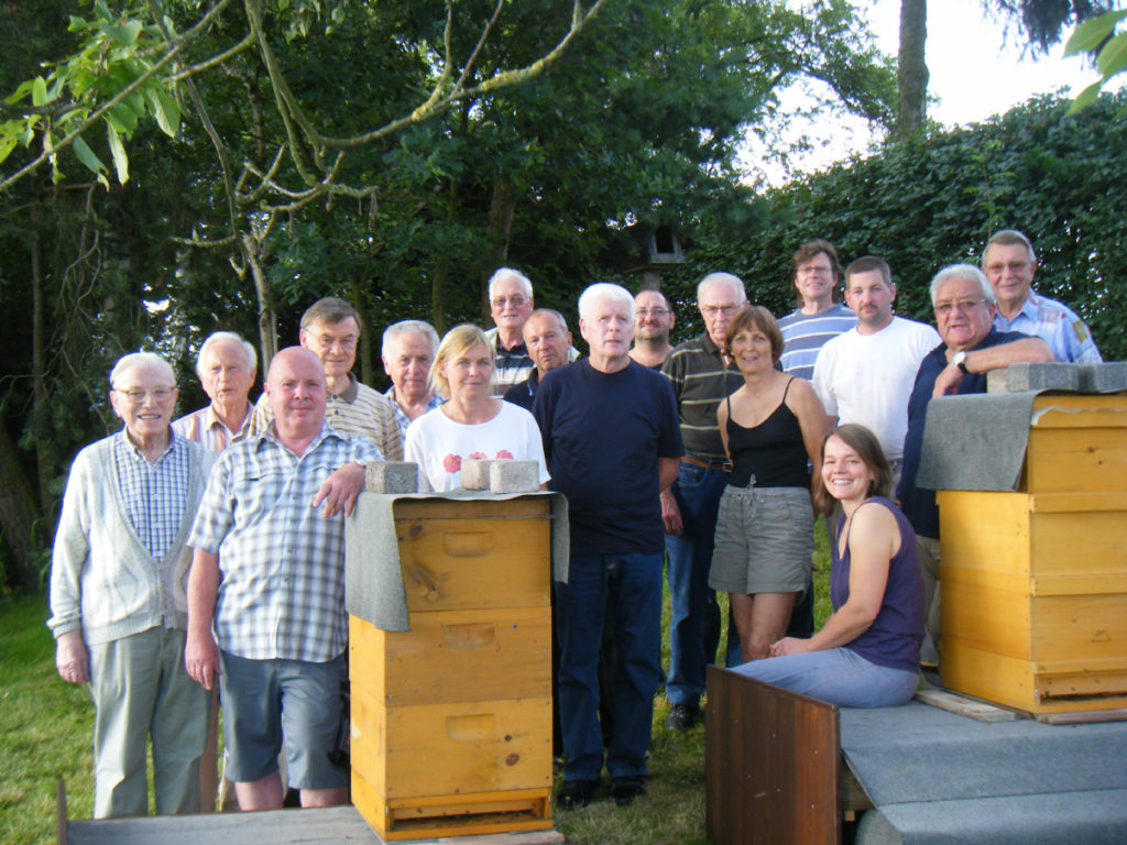 Auf dem Foto präsentiert sich der Verein auf dem vereinseigenen Gelände mit seinen eigenen Bienenvölkern. Nur der Fotograf musste vor den Fluglöchern stehen und knipsen...